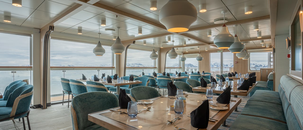 Mittag- und Abendessen findet im Jens Munk Restaurant auf Deck 5 statt. Um unterschiedlichen Geschmäckern und Ernährungsbedürfnissen gerecht zu werden, können die Gäste aus einer Auswahl an Fleisch-, Fisch- und vegetarischen Optionen wählen. Abends wird à la Carte serviert.