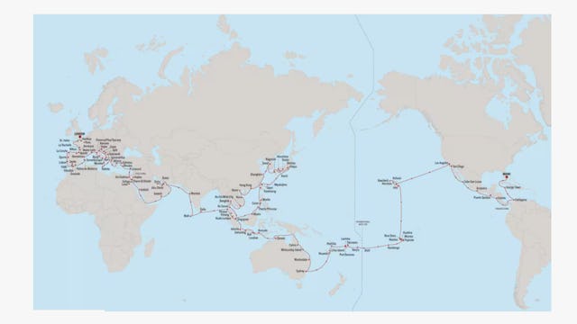 Überqueren Sie dann das Arabische Meer zu den modernen Metropolen Dubai und Abu Dhabi und den alten Tempeln Ägyptens, durchqueren Sie den Suezkanal, um das Mittelmeer von Griechenland bis Spanien zu erkunden, bevor Sie die Iberische Halbinsel umrunden, um die Weinberge von Bordeaux zu besuchen.