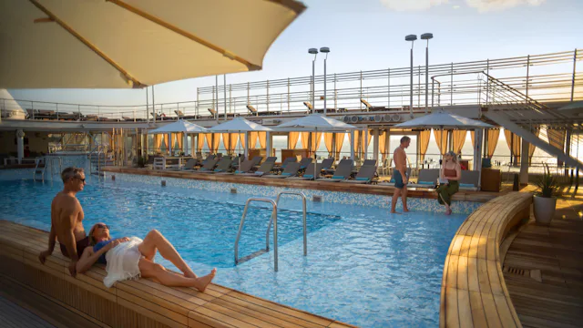 An Deck lädt das elegante Pool Deck dazu ein, unter freiem Himmel zu entspannen, den Blick über das offene Meer schweifen zu lassen oder bei einem Cocktail die Sonne im Ozean versinken zu sehen. Im stilvollen Spa- und Wellnessbereich sorgen wohltuende Anwendungen, Sauna, Dampfbad sowie moderne Fitness- und Yogaangebote für neue Energie und vollkommene Entspannung.