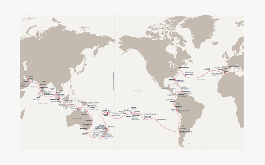 Auf sieben einzigartigen Passagen erleben die Gäste die Welt als eine einzige fortlaufende Reise. Die EXPLORA I wird vom imposanten Dubai aus in See stechen und fährt entlang der nach Gewürzen duftenden Küsten Indiens und der schillernden Meere der Malediven, bevor es weiter in Richtung Sri Lankas heiliger Schönheit, dem pulsierenden Herz Südostasiens, und zu den Insellandschaften von Bali und Komodo geht. Die Reise führt anschließend durch die Meere Ozeaniens, mit entschleunigten Erlebnissen in Cairns, Airlie Beach, Brisbane, Sydney und Melbourne, bevor Sie die wilde Schönheit Tasmaniens und die smaragdgrünen Fjorde Neuseelands entdecken. Im Herzen des Pazifiks können die Gäste die Gastfreundschaft Fidschis sowie den kulturellen Reichtum Tongas und der Cookinseln erleben. Das türkisfarbene Wasser Französisch-Polynesiens lädt zu Momenten der Ruhe ein, während es auf der Osterinsel monumentale Bauwerke zu erkunden gilt – eine einmalige Entdeckungsreise zu den abgelegensten Wundern der Welt. Die EXPLORA I fährt weiter entlang der Pazifikküste Südamerikas und führt Sie durch die kulturellen Schätze Chiles und Perus, bevor Sie den Panamakanal erreichen, erleben Sie einen besonderen Moment, wenn Sie von einem Ozean in den anderen gelangen. Nach einer Reise durch das beeindruckende Blau der Karibik geht es weiter durch die pulsierenden Rhythmen Amerikas, bevor die Reise inmitten der abgelegenen Inseln der Azoren im Atlantik und der einladenden Wärme des Mittelmeers endet.