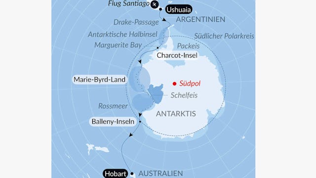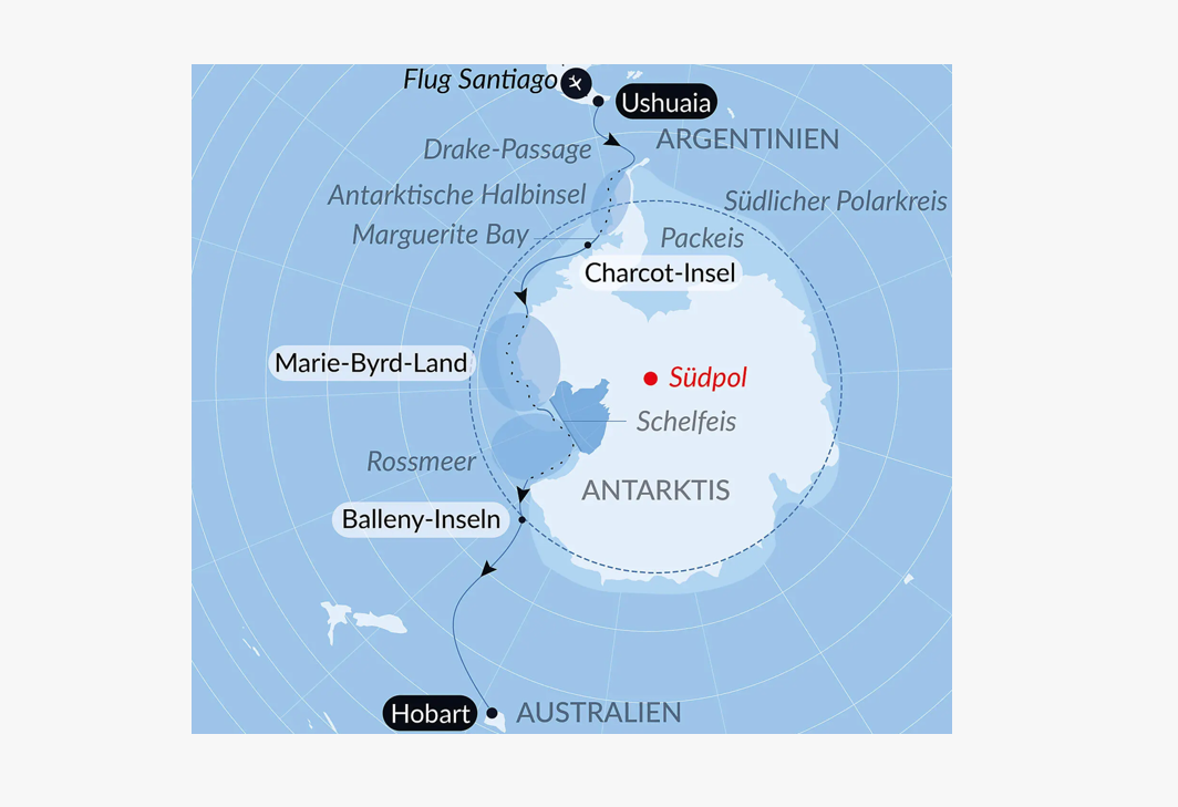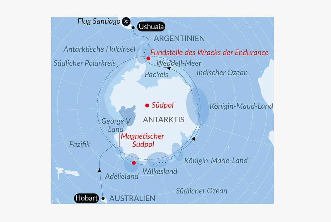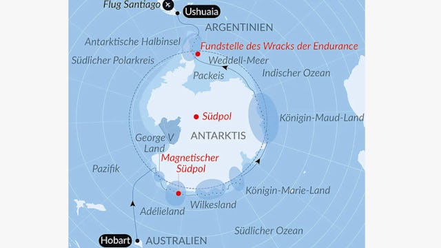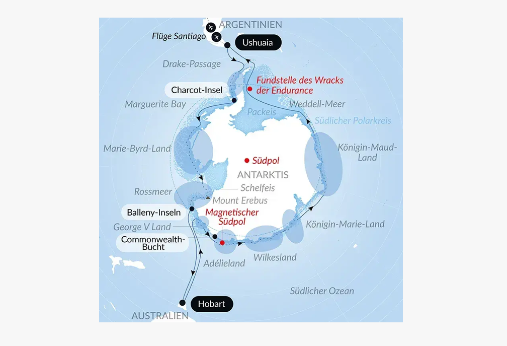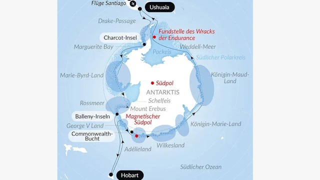 ✓ Vom Gebiet des Endurance-Wracks, das abgelegene Marie-Byrd-Land, Wilkesland, Adélieland bis zu den rauen Balleny-Inseln – entdecken Sie einige der entlegensten Küsten der Erde